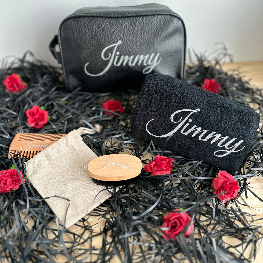 1 boîte cadeau , 1 petite serviette personnalisée, 1 trousse personnalisée, 1 kit barbe personnalisé.